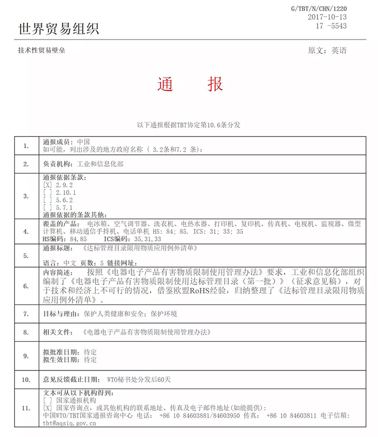 今年夏天在國內征求意見的中國RoHS第一批《達標管理目錄》與“應用例外情況”備受行業關注,2017年已經馬上過去了,不少電子、家電產品的生產企業都非常關心目前“達標管理目錄”的進展。 目前,中國RoHS第一批《達標管理目錄》與“應用例外情況”已經于2017年12月11日結束了在WTO上進行的TBT通報,已經進入了30天的評議期。 順利的話,預計中國RoHS第一批《達標管理目錄》會在2018年的春天發布。 正式發布以后會設置一定的過渡時間,給相關生產企業、制造商留出相應的時間調整。 下面的截圖為中國RoHS第一批《達標管理目錄》與“應用例外情況”的WTO/TBT通報 通報G/TBT/N/CHN/1219 《電器電子產品有害物質限制使用達標管理目錄(第一批)》(征求意見稿)