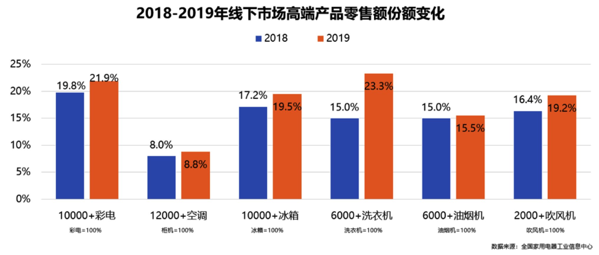 具體到不同品類的表現,傳統大家電中,彩電、空調、冰箱都出現了下滑,尤其是彩電市場出現兩位數的下滑,但彩電向更大尺寸進化的趨勢十分顯著,空調市場變頻和變頻APF一級空調市場份額繼續增長,冰箱中多門產品份額提升;洗衣機市場受益于顯著的產品升級,實現了小幅增長,帶有烘干功能的滾筒洗衣機受到消費者熱捧;干衣機產品受到消費者關注,市場規模快速擴大,增幅接近50%。廚衛產品中,傳統的煙機、灶具、熱水器都出現規模下滑,洗碗機,集成灶表現尚可,洗碗機產品嵌入式是主流,對餐具的“消毒”和“烘干”功能成為新的升級方向;生活家電產品中,由于不斷有新品類出現,整體規模維持了增長,隨著消費者自主消費意識的覺醒,美發、個人護理類產品增長明顯;而近年商品房“全裝修”政策的全面推進,也給中央集成家電帶來了新的契機。整體來看,2019年國內家電市場雖然遭遇規模瓶頸,但新興品類中依然不乏亮點和機會。